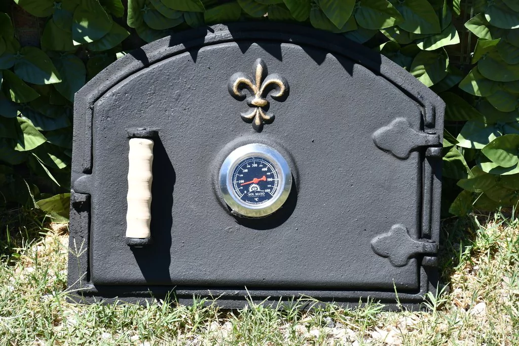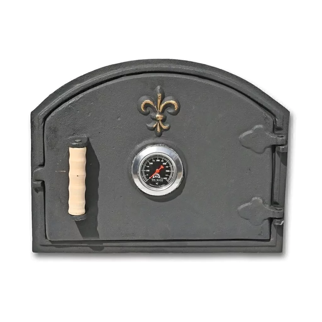 Su construcción en hierro de fundición asegura una excelente retención del calor, mientras que el reloj pirómetro te permite monitorear la temperatura de manera precisa. Esta puerta es ideal para quienes buscan un control total en la cocción de sus alimentos.
